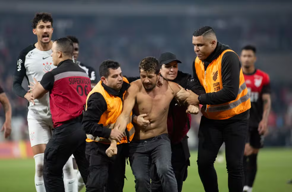 Aos 52 minutos do segundo tempo, quando o Corinthians já vencia o confronto por 1 a 0, um homem saiu de um setor destinado à torcida do Athletico, invadiu o campo e agrediu o goleiro Hugo Souza.