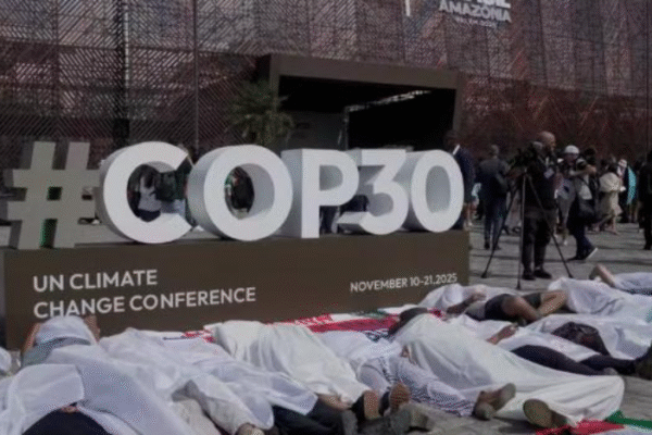 Uma manifestação pacífica de ativistas mexicanos trouxe um momento de reflexão na entrada da Zona Azul da cúpula, com manifestantes deitados no chão cobertos por lençóis, representando defensores ambientais mortos ou perseguidos.