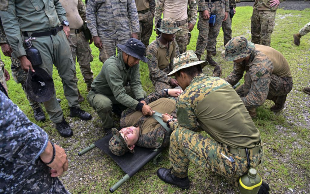 Fuzileiros navais dos Estados Unidos e policiais panamenhos realizaram ,simulações de resgate e transporte em helicóptero de feridos em combate na antiga base de Sherman, no Canal do Panamá, na última terça-feira, 2. O exercício, observado por jornalistas da AFP, integra manobras que ocorrem desde agosto e se estendem até 18 de dezembro, com 25 militares americanos e 25 panamenhos.